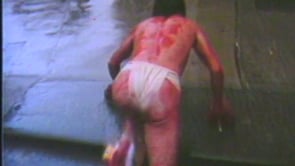 Thomas Bühler's crawl up Broadway took place on Sept. 27, 1985. After developing his "TOMBU CRAWLERS", he spent one year training for the event. Bühler, his body painted red, began the crawl from South Ferry at 7 a.m. and completed it at the Museum of the American Indian, 155th St. and Broadway at 2:10 p.m., covering a distance of approximately 12 miles. By coincidence, Hurricane Gloria struck New York City during these same hours, making it, until the very end, highly as the whether the event could be realized.